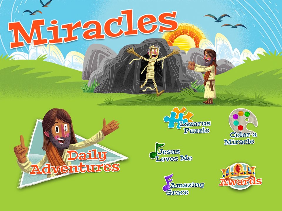 Artwork by Luke Flowers. Design by Sam Carbaugh and Jeremy Culp. The app works around 30 daily devotions kids can read. The app unlocks readings as users progress.